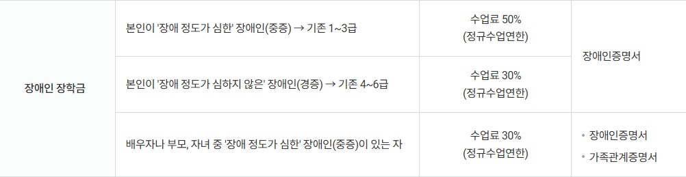 교내장학금 중 지원자 본인 및 직계가족이 장애인증명서 발급이 가능하면, 장애인장학금 신청이 가능합니다.
