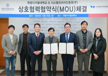 우리 대학이 12월 26일 시스템코리아인증원과 단체협약을 체결했다. [사진 왼쪽 김윤철 총장, 오른쪽 김철 원장] 이번 협약은 산업안전보건분야의 전문가 양성 및 공동 발전 기반을 마련하기 위해 추진되었다. 협약식에는 시스템코리아인증원에서 김철 원장, 곽현철 본부장, 유보라 실장이 참가했으며 원광디지털대학교에서는 김윤철 총장, 임대성 산업안전보건학과 학과장, 김재현 대외협력팀장, 김인성 담당관이 참석해 양 기관 간 교류 및 협...